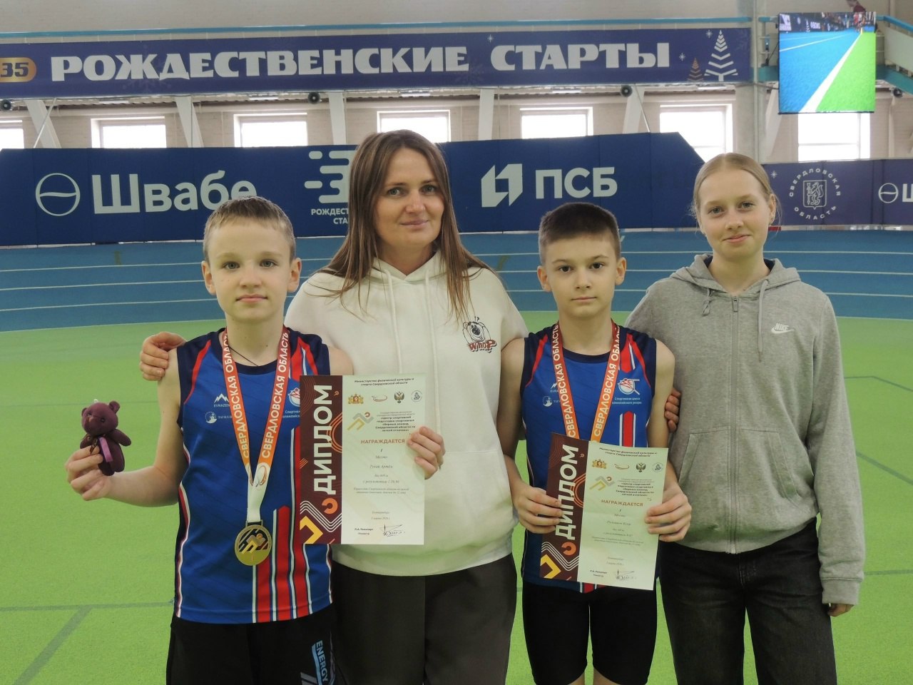 Егор Ромашов из СШОР «Юпитер» победил в беге на 60 метров. У Ксении Подлевских на этой же дистанции «серебро». Артем Тукай – лучший на дистанции 600 метров. Тренеры – Дарья Лапина и Артем Григорьев.
