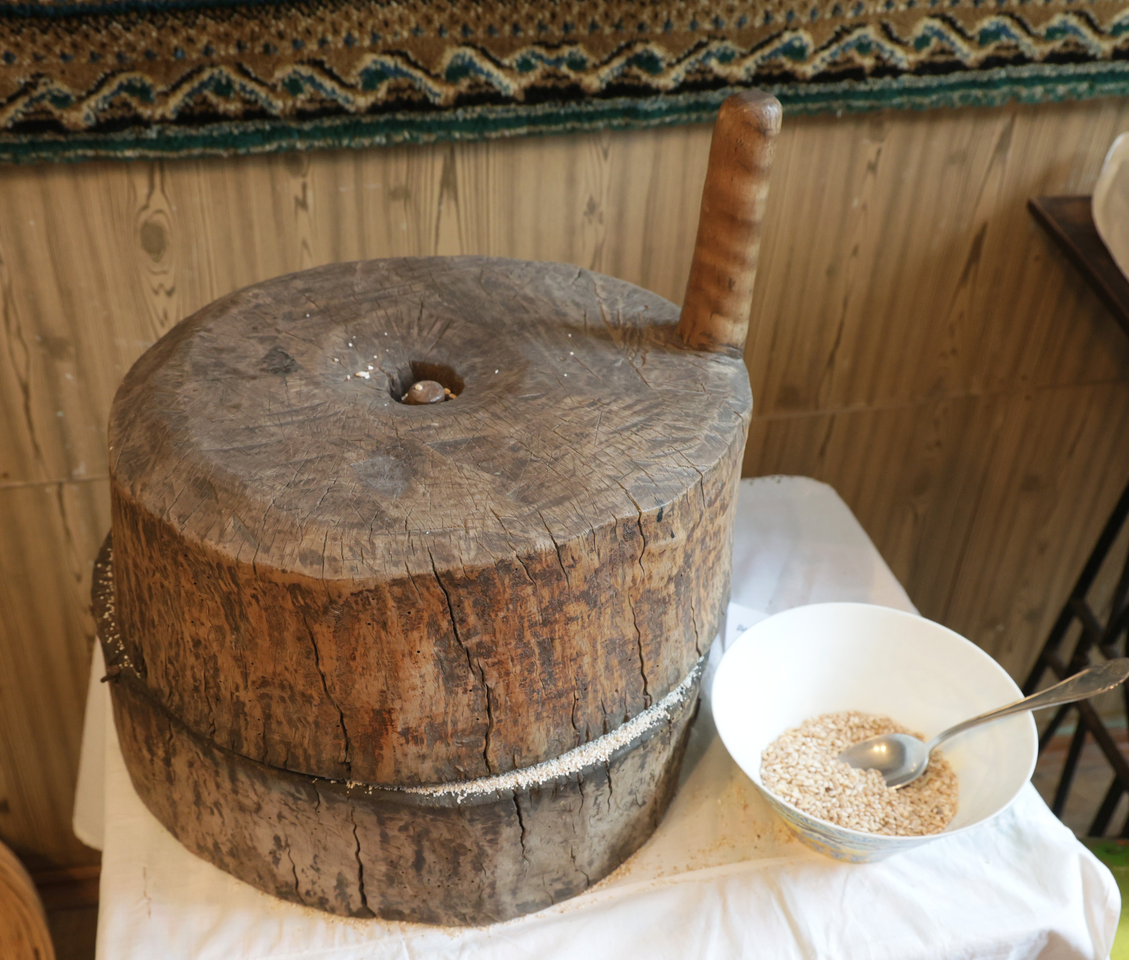 Удивительный механизм до сих пор в отличном состоянии, Лилия Мадариковна продемонстрировала нам, как перемалываются зерна:
