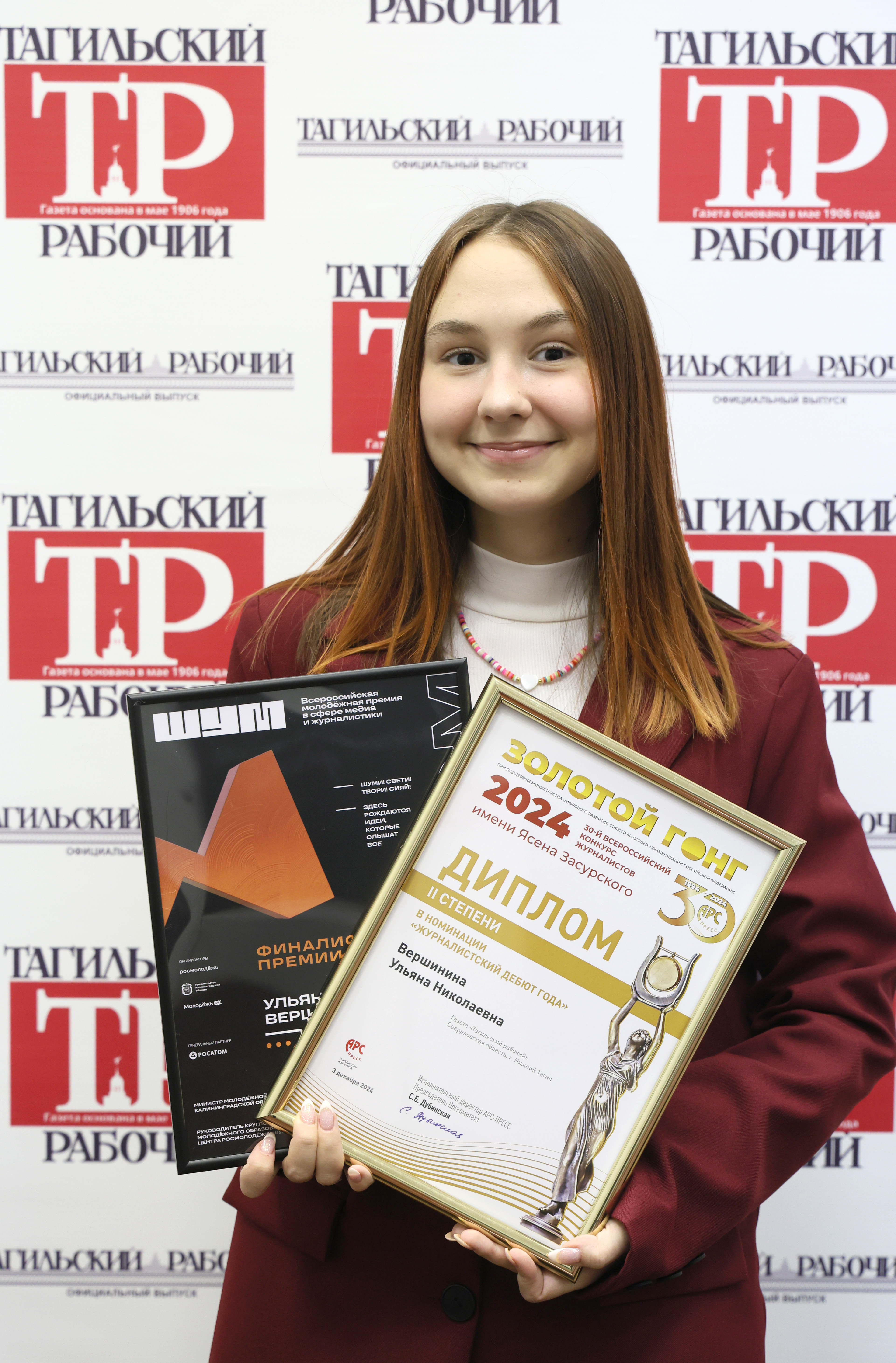 А еще эта поездка запомнилась тем, что параллельно я должна была присутствовать на награждении всероссийского конкурса журналистов имени Ясена Засурского «Золотой гонг». О победе в нем стало известно буквально за день до вылета в Москву. Награждение на обоих конкурсах совпало – в один день, в одно и то же время. Я металась: «Что же делать?» Выручил папа, который поехал со мной в Москву. Он получил диплом «Золотого гонга», пока меня награждали на «ШУМе».