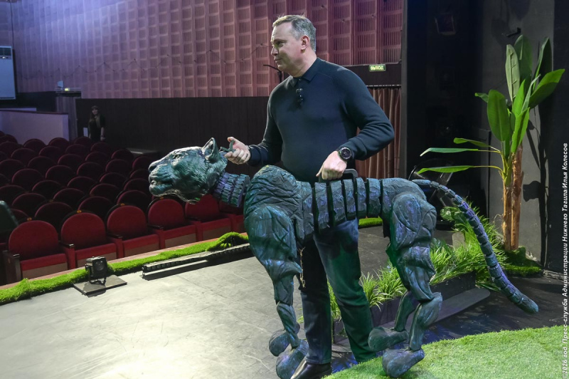 Владислав Пинаев подержал на руках кукол-волчат, попробовал управлять пантерой, посмотрел, как примеряют костюм медведя, и отметил, что у актеров хорошая физическая подготовка, чтобы выдержать весь спектакль с такой нагрузкой.